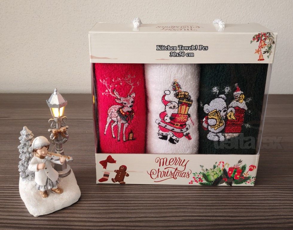 - Kvalitná 3-dielna darčeková sada vianočných bavlnených froté utierok.