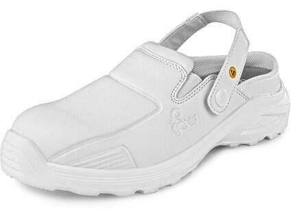 Bílý nazouvák s polohovatelným patním páskem, ESD vlastnostmi a antibakteriální úpravou Sanitized. Materiál: svršekz hladkého mikrovlákna jednoduchého na údržbu. Podšívka z prodyšné síťoviny a odolného mikrovlákna. Stélka: komfortní HI-POLY. Podešev: PU, antistatická, olejivzdorná, protiskluzová.